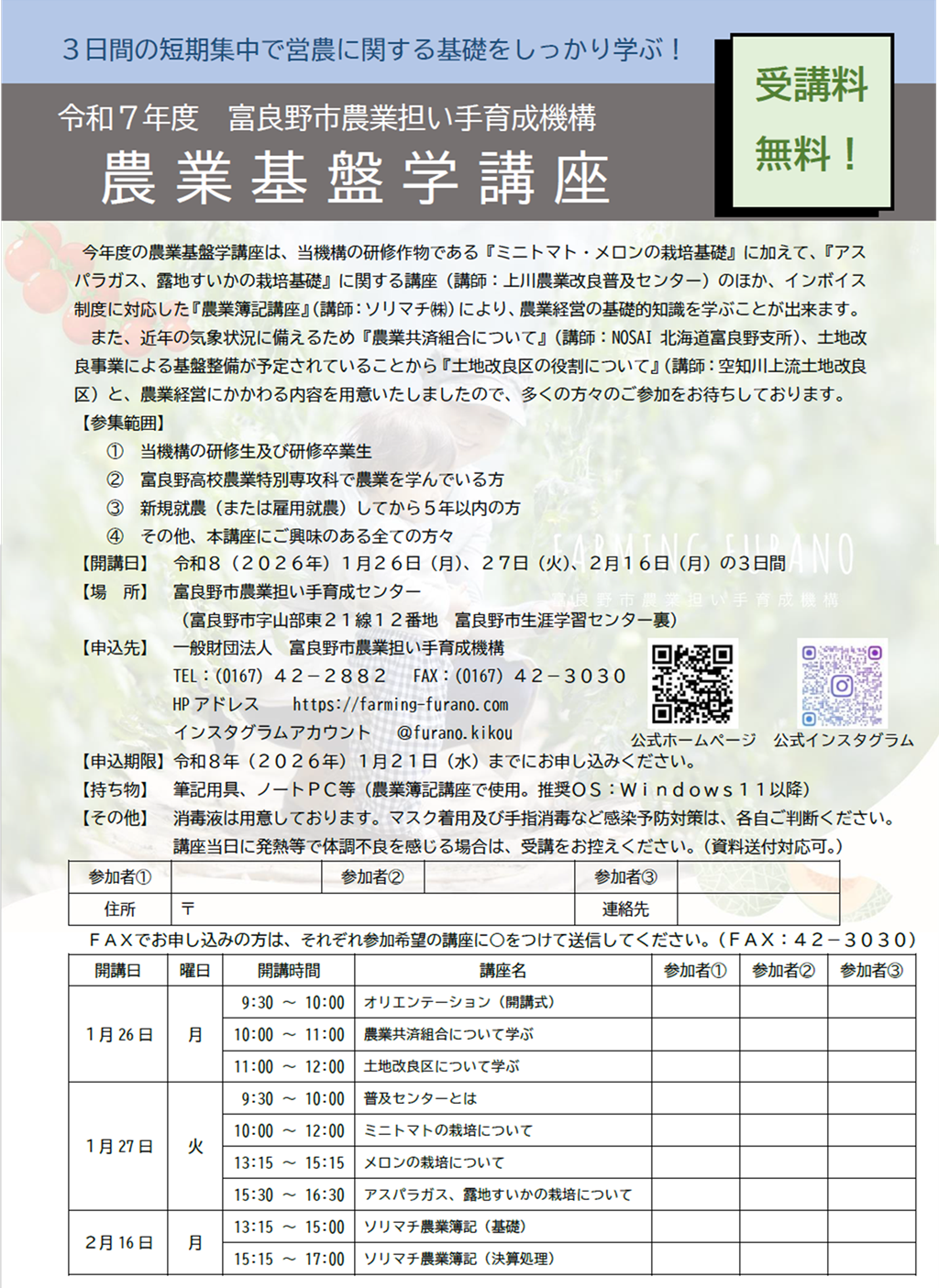 今年度の農業基盤学講座は、当機構の研修作物である『ミニトマト・メロンの栽培基礎』に加えて、『アスパラガス・露地すいかの栽培基礎』に関する講座(講師:上川農業改良普及センター)のほか、インボイス制度に対応した『農業簿記講座』(講師:ソリマチ㈱)により、農業経営の基礎的知識を学ぶことが出来ます。